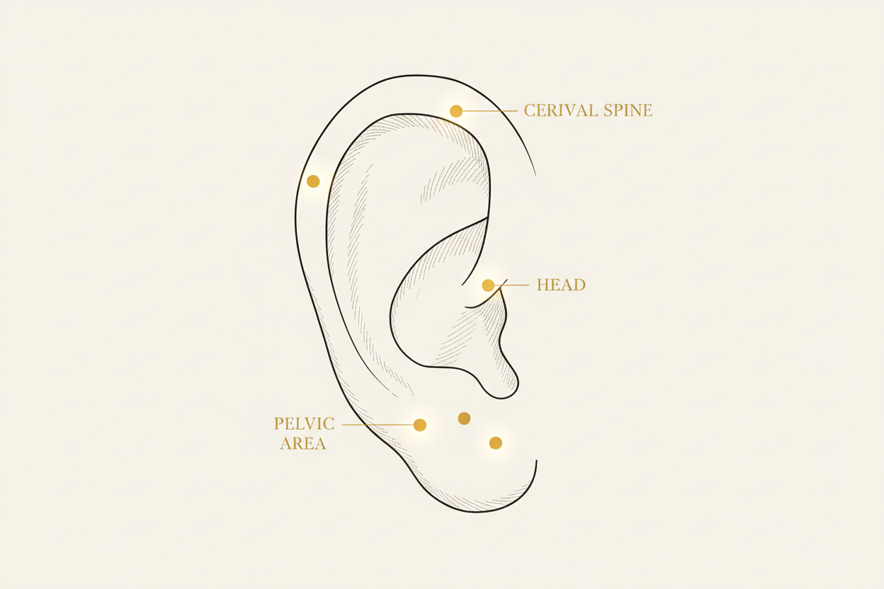 If you sit at a desk all day, you likely hold tension in your upper body. The outer ridge of the ear (the antihelix) corresponds to the spine. You can find specific points for the cervical spine (neck) and lumbar spine (lower back) along this curve. Pressing these areas can help release muscular knots.