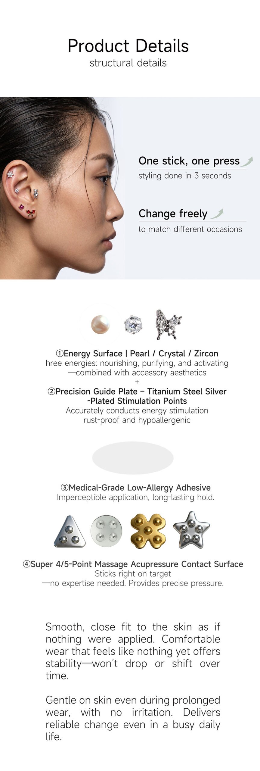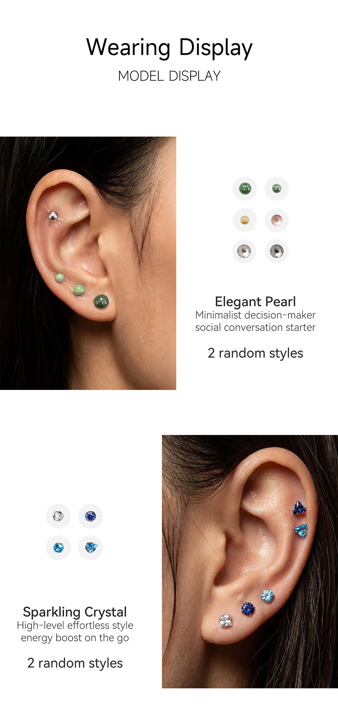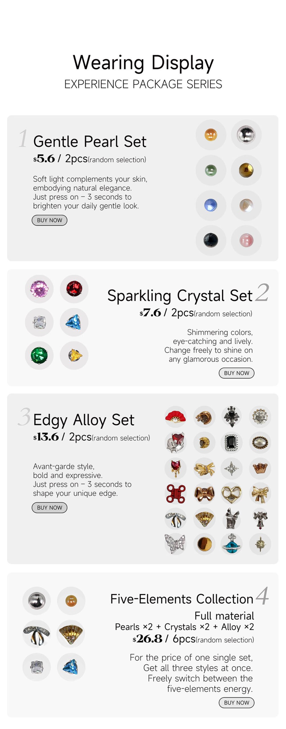 Gentle Pearl Set( 2pcs random selection), Sparkling Crystal Set(2pcs random selection), Edgy Alloy Set(2pcs random selection), Five-Elements Collection-Full material(Pearls x2 + Crvstals x2 +Alloy x2) |